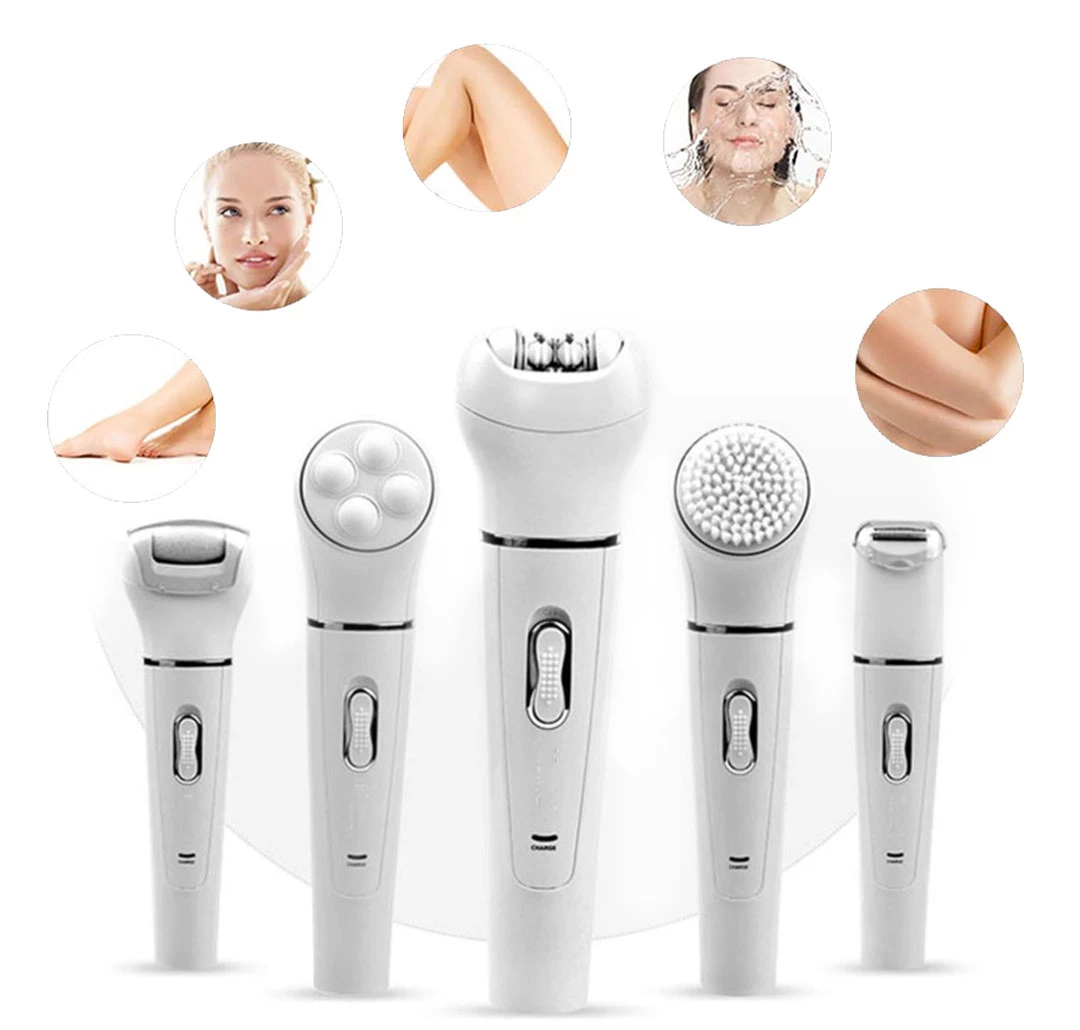 اكتشفي مجموعة العناية بالجسم 5 في 1 – 5 in 1 Beauty Tools Kit للعناية بالبشرة والشعر والأظافر. جهاز تجميل نسائي متكامل لتنظيف البشرة، إزالة الشعر، والتقشير بفعالية. مثالي للنساء في السعودية الباحثات عن الجمال الطبيعي والنعومة الدائمة. 💖